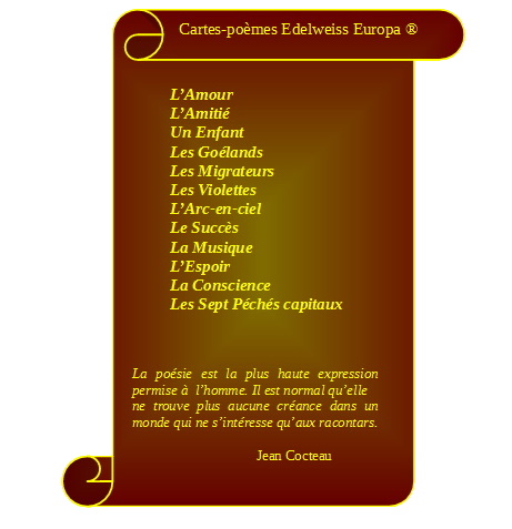 Les cartes-poèmes Edelweiss Europa sont toujours personnalisées par vos coordonnées professionnelles, cartes-poèmes qui ne vous coûtent rien puisque vous les revendez. Un article artistique, novateur, exceptionnel...et rémunérateur !
